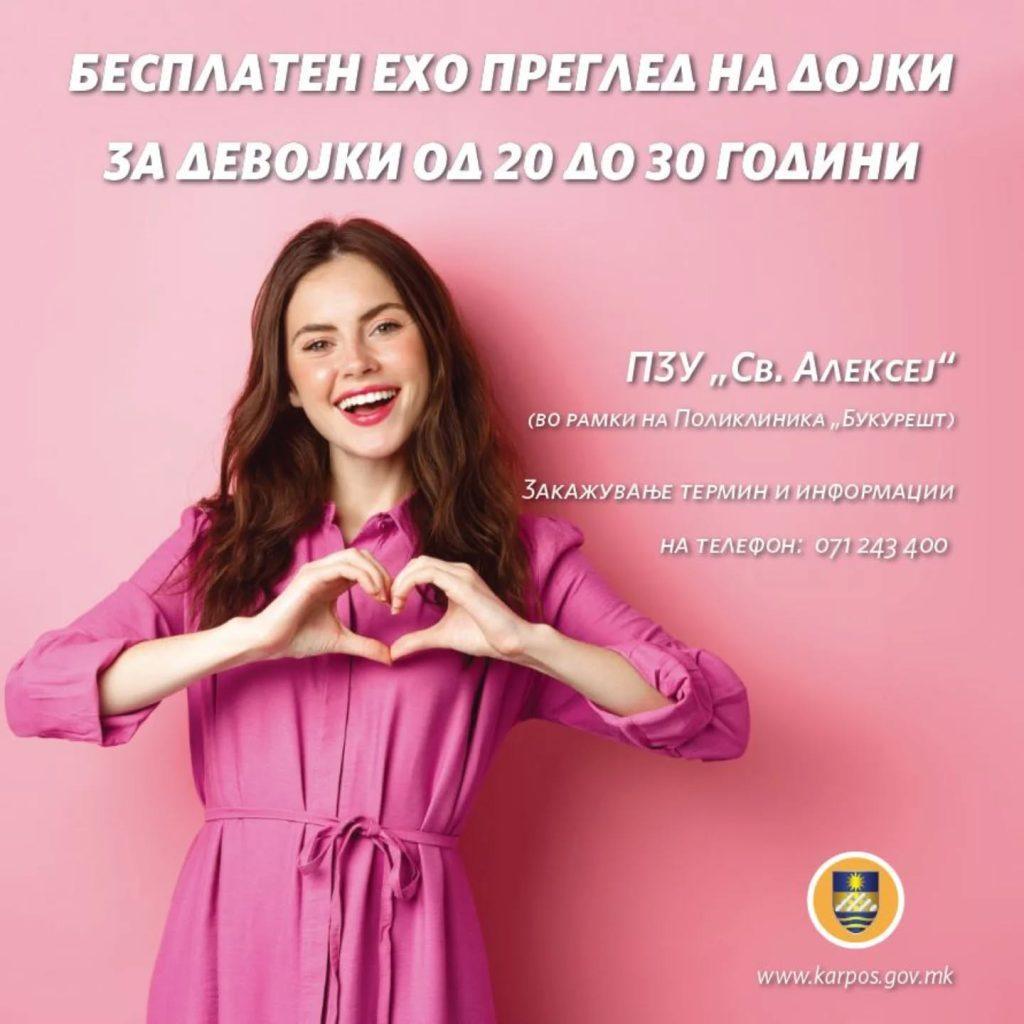 Овој проект се реализира преку Програмата за еднакви можности меѓу жените и мажите за 2025 година на Општина Карпош, како проектна активност за превенција и поддршка на женското здравје во соработка со приватната здравствена установа „Св. Алексеј“ која се наоѓа во Поликлиника Букурешт во Карпош 3. Овие бесплатни ехо прегледи на дојки се наменети за девојки од 20 до 30 годишна возраст и за истите локалната самоуправа издвои 200.000 денари.