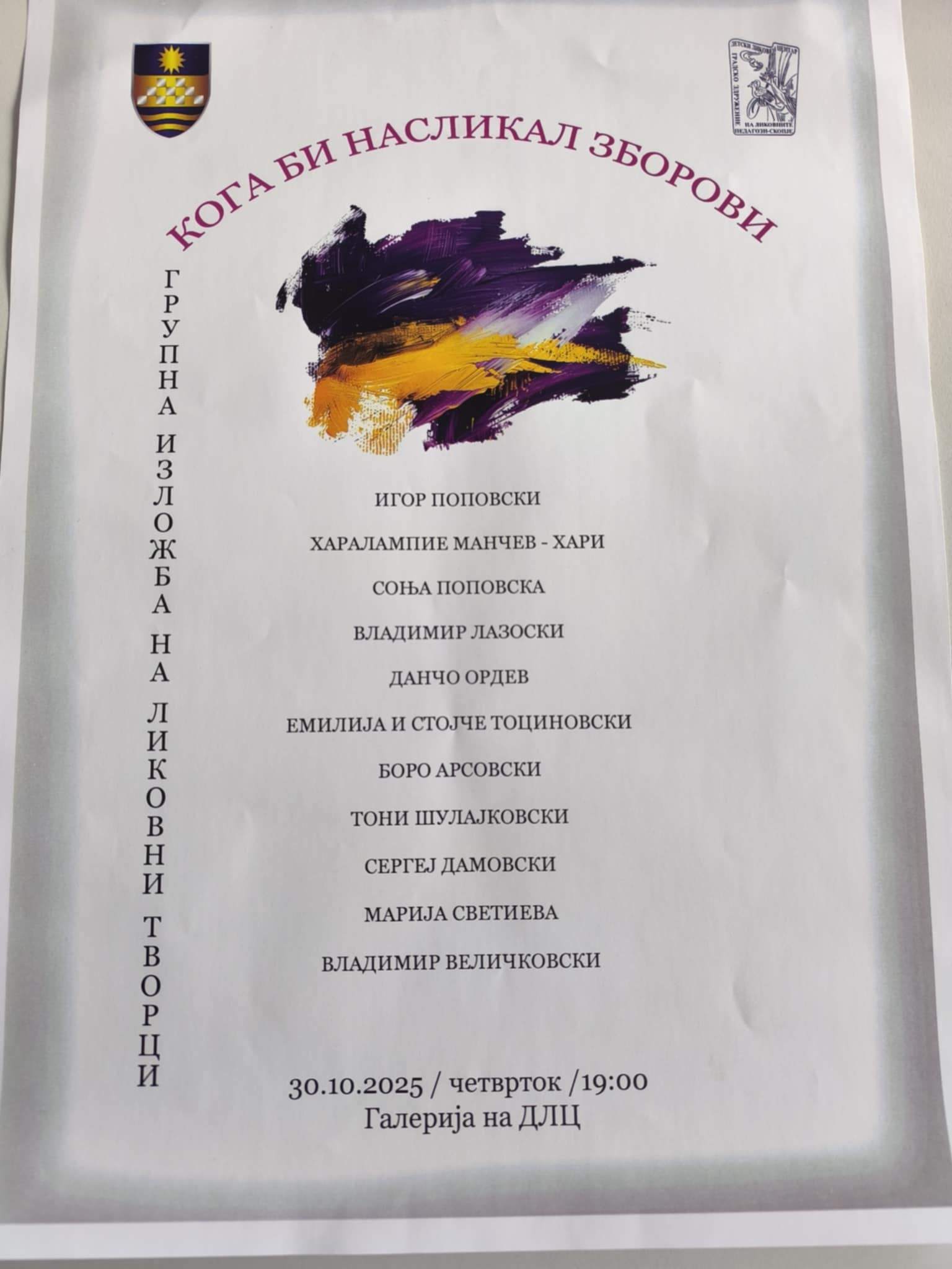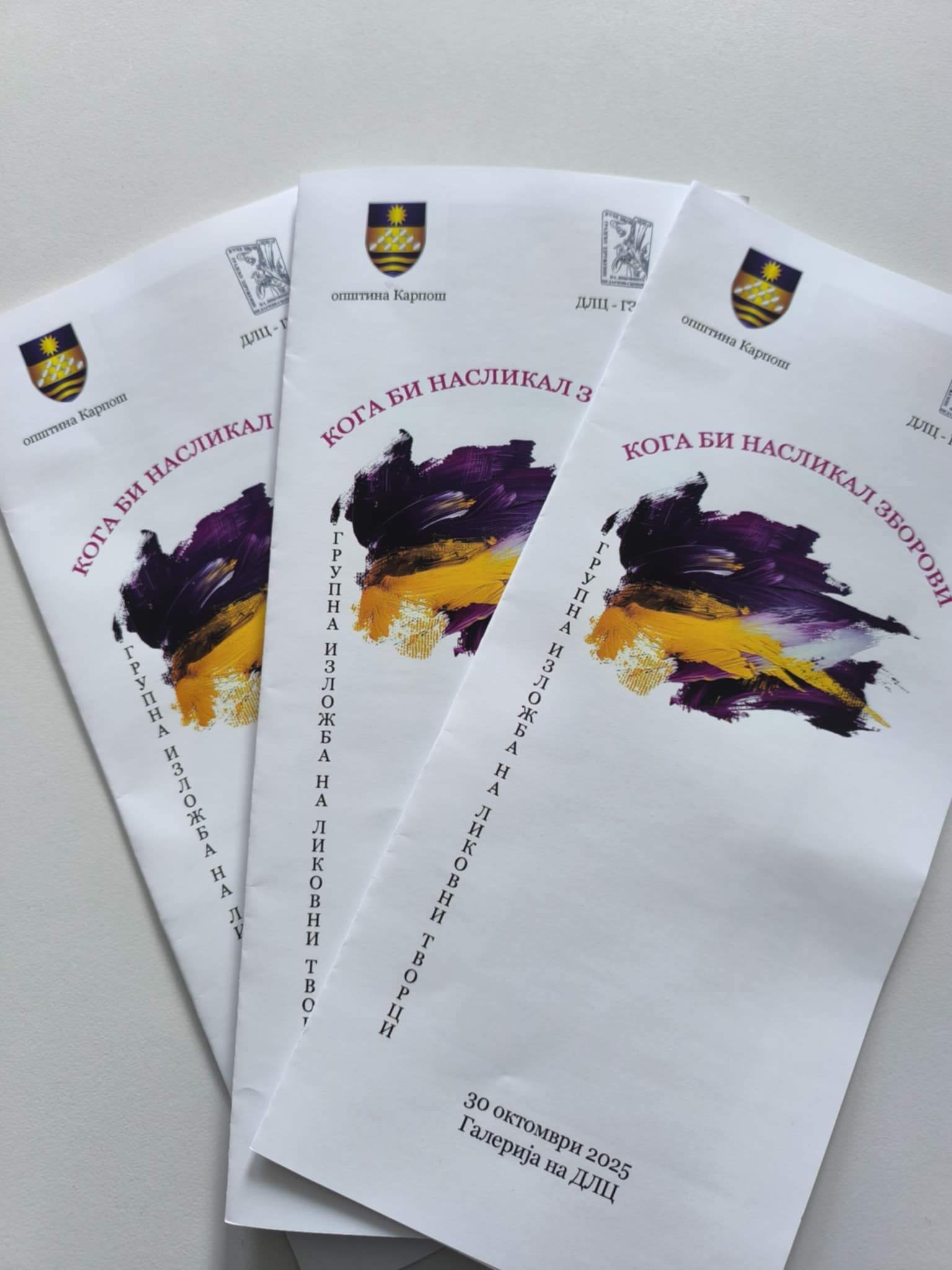 Вечерва (30.10.2025) со почеток од 19 часот, во Кинотеката на РСМ, официјално за сите посетители, ќе биде отворена групната изложба со наслов ,,Кога би насликал зборови”, на која со свои дела ќе се претстават 11 академски ликовни уметници од Општина Карпош. Настанот има за цел да ја афирмира уметничката сцена на општина Карпош која воедно е и покровител на оваа изложба и да ја истакне креативната енергија.