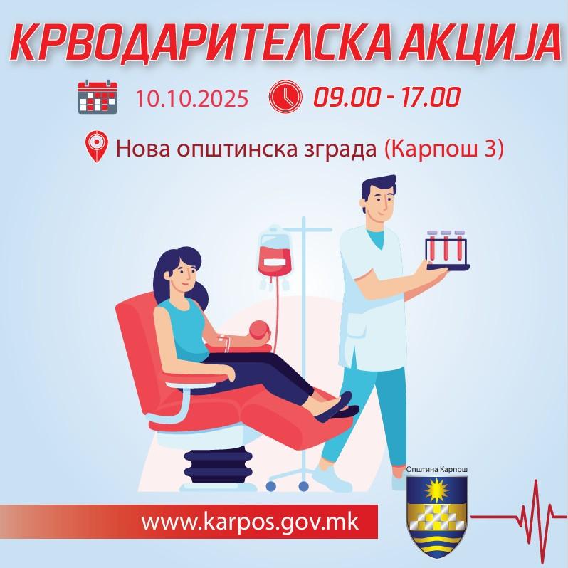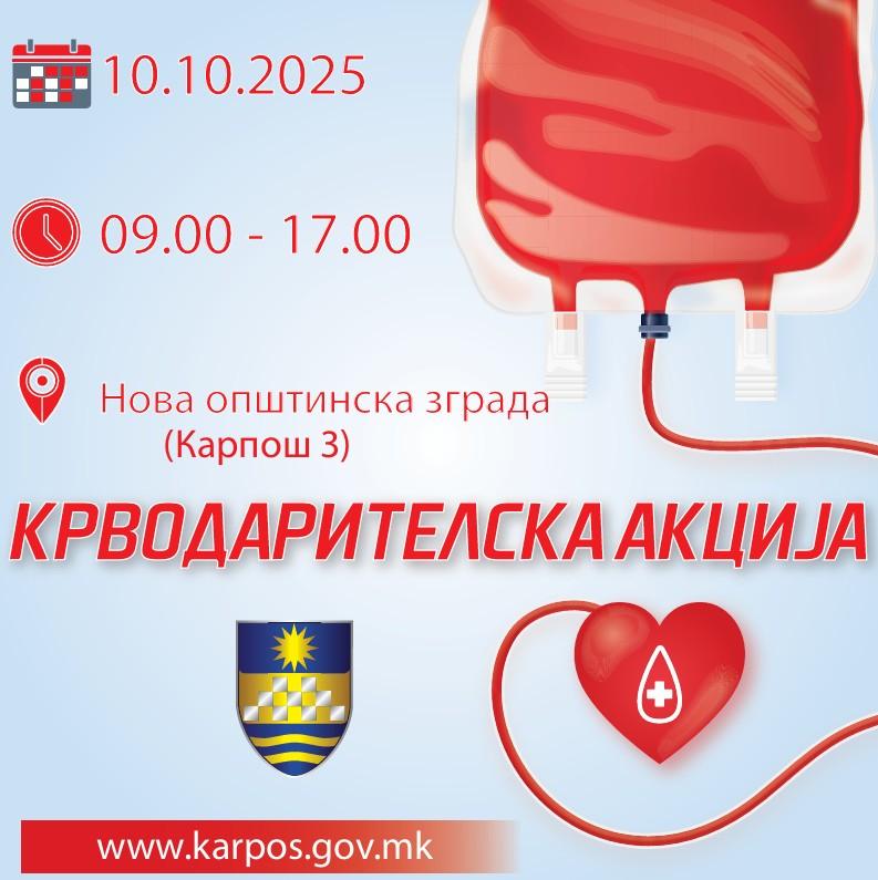 По повод Денови на Општина Карпош, на 10.10.2025 (петок) во новата општинска зграда во Карпош 3, ќе се одржи традиционалната крводарителска акција , која ќе започне од 9 часот и ќе трае до 17 часот.