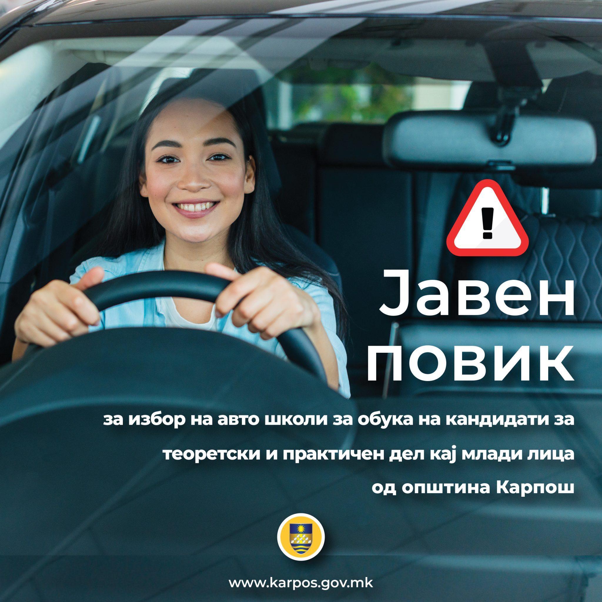 ЈАВЕН ПОВИК за избор на авто школи за обука на кандидати за теоретски и практичен дел кај млади лица од Општина Карпош