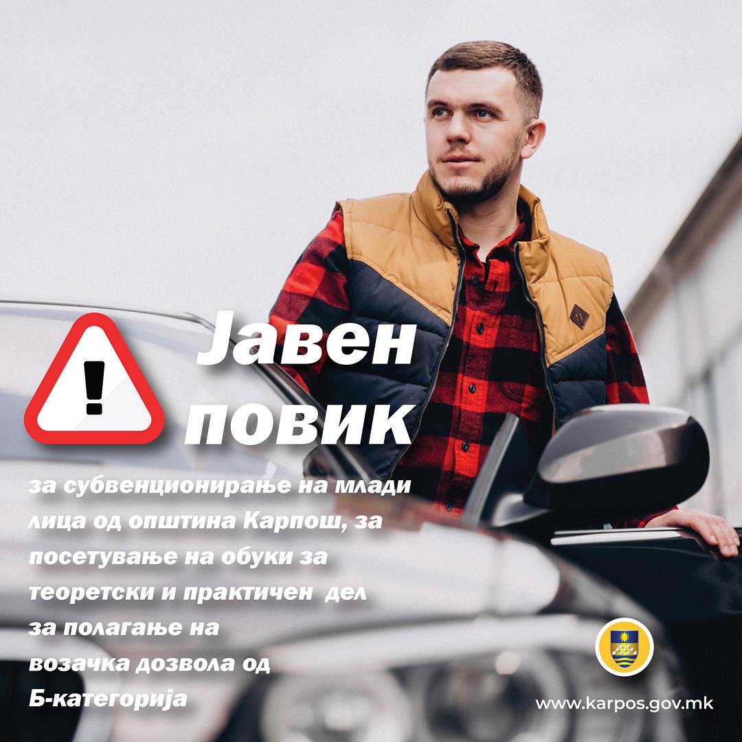 ЈАВЕН ПОВИК за субвенционирање на млади лица од Општина Карпош за посетување на обуки за теоретски и практичен дел за полагање на возачка дозвола Б категорија од Општина Карпош